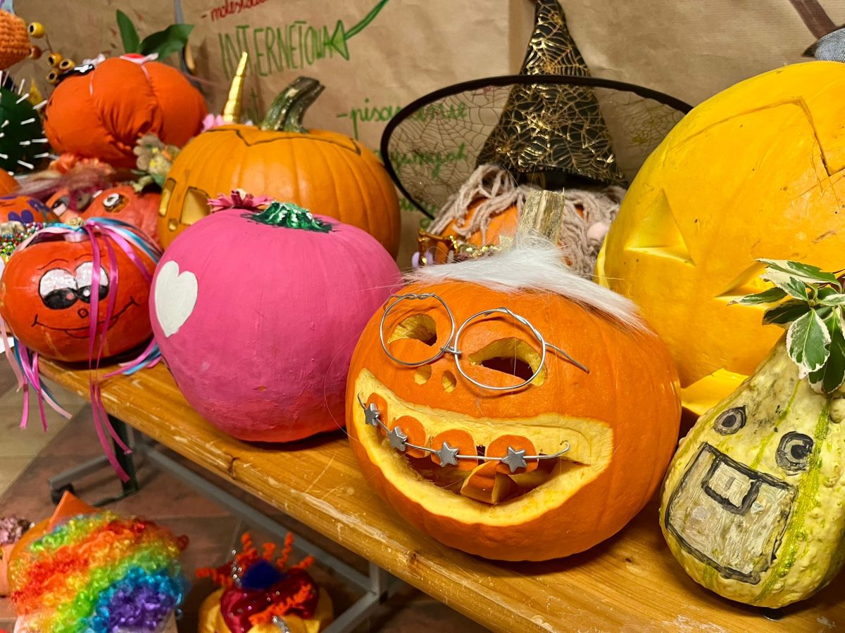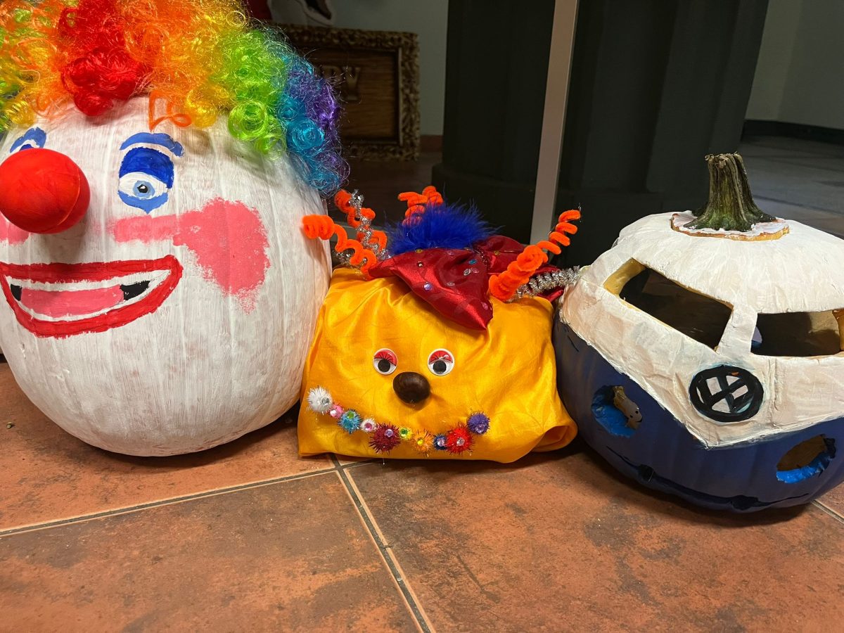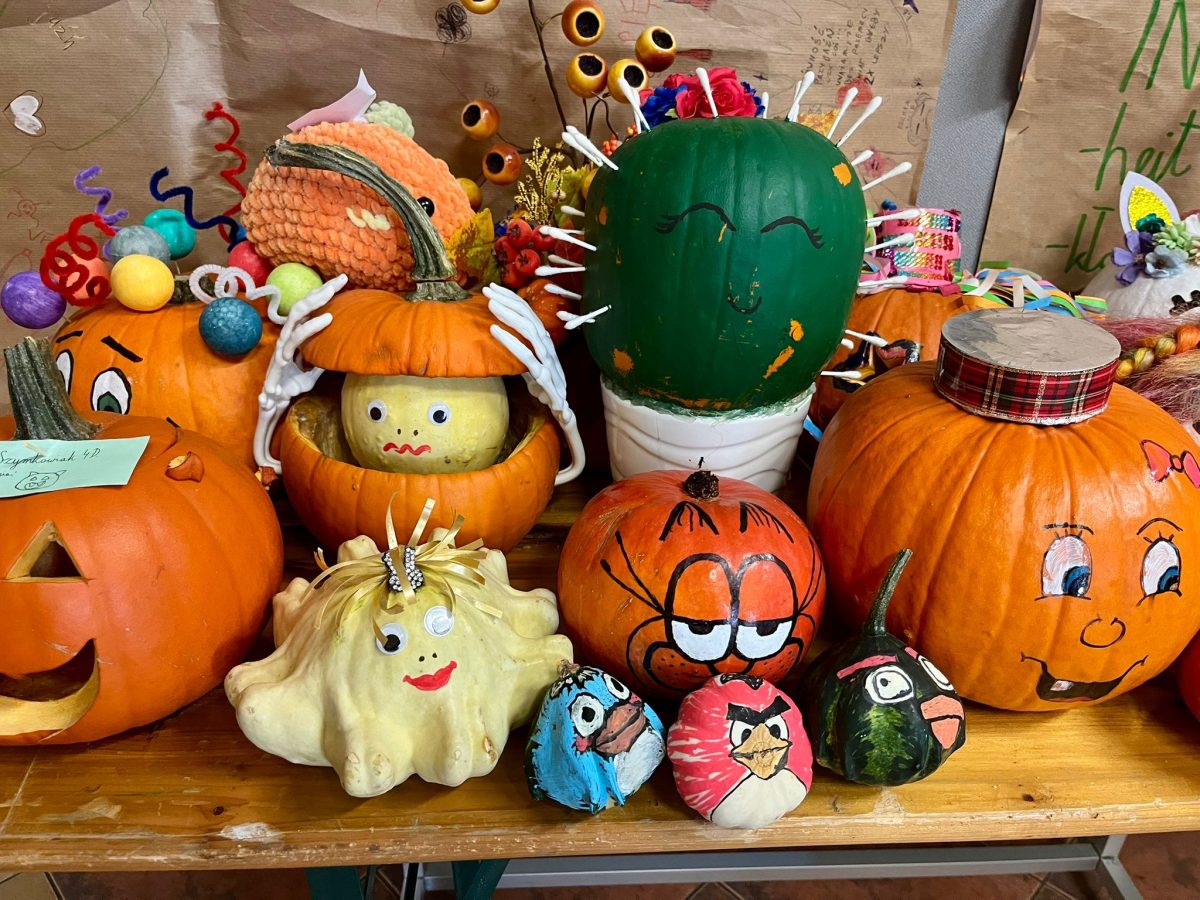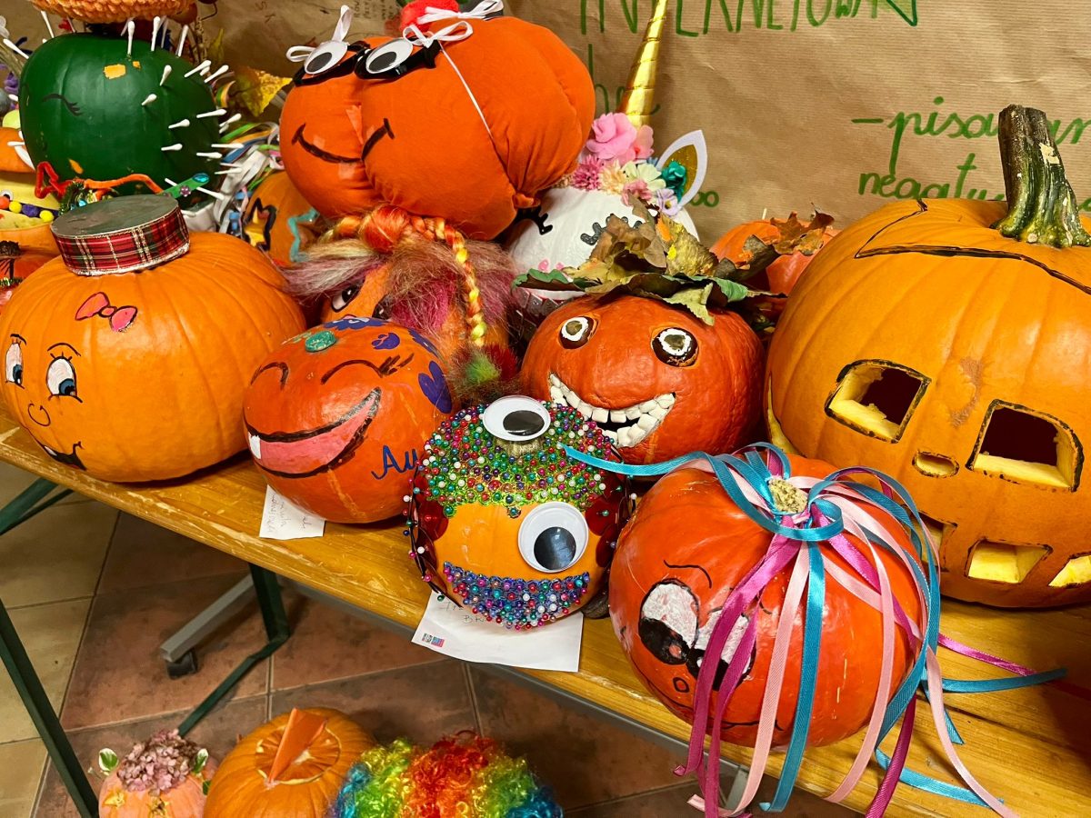 Każda dynia była wyjątkowa – uśmiechnięta, psotna, czasem zaskakująca – i wszystkie razem stworzyły przepiękną, kolorową wystawę przy wejściu do szkoły 🧡